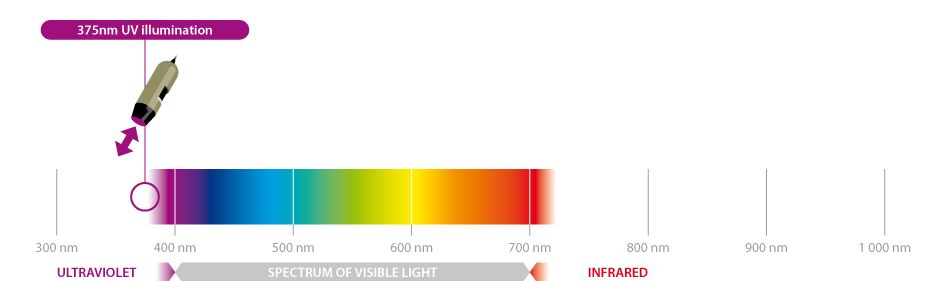 UW-serien har to typer LED-lys, der kan skiftes mellem hvidt og UV-lys. Denne model har et filter til at filtrere det tilbagevendende UV-lys ud, så der kan opnås et billede med naturlige farver.